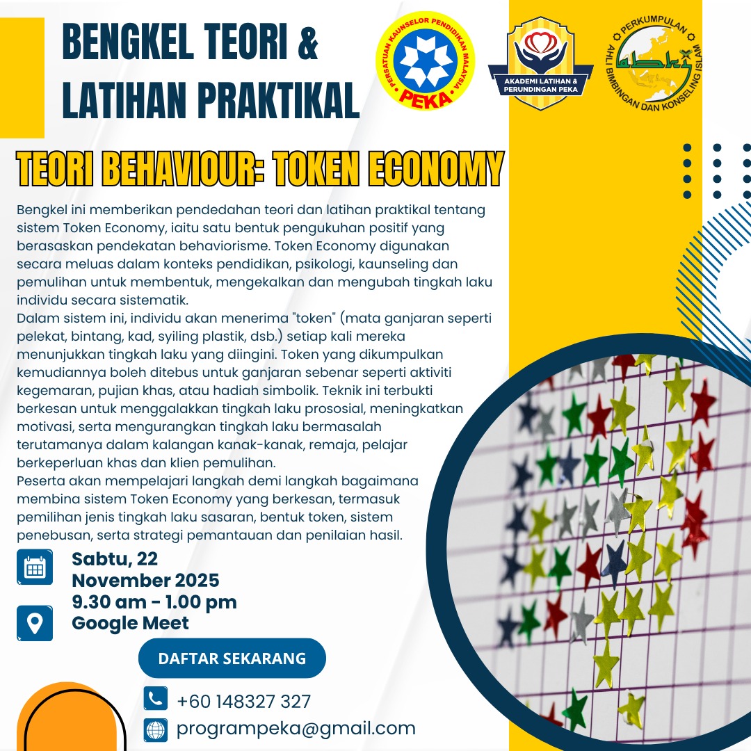 Bengkel intensif ini memberi pendedahan teori dan latihan hands-on tentang sistem Token Economy—strategi pengukuhan positif berasaskan behaviorisme yang terbukti membantu membentuk, mengekalkan dan mengubah tingkah laku secara sistematik. Sesuai untuk konteks pendidikan, psikologi, kaunseling dan pemulihan (kanak-kanak, remaja, pelajar berkeperluan khas, serta intervensi tingkah laku di rumah/sekolah).